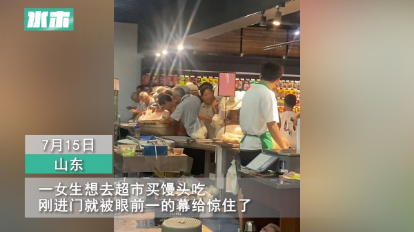 7月15日,山东。一女生想去超市买馒头吃,刚进门就被眼前一的幕给惊住了。只见一群大爷大妈围在馒头铺前,哄抢超市刚刚出锅的馒头。