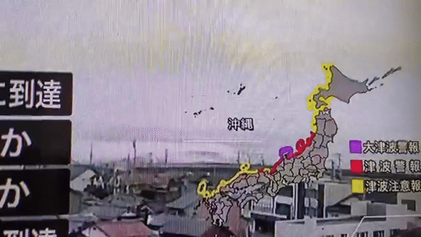 日本的NHK警告称海浪或高5米,敦促人们尽快逃往高地或附近建筑物的顶部。