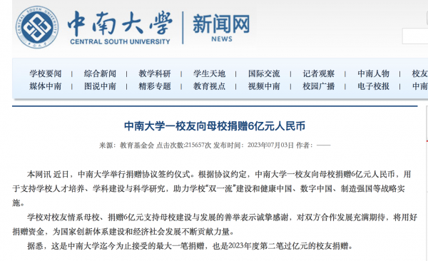这是中南大学迄今为止接受的最大一笔捐赠,也是2023年度第二笔过亿元的校友捐赠。