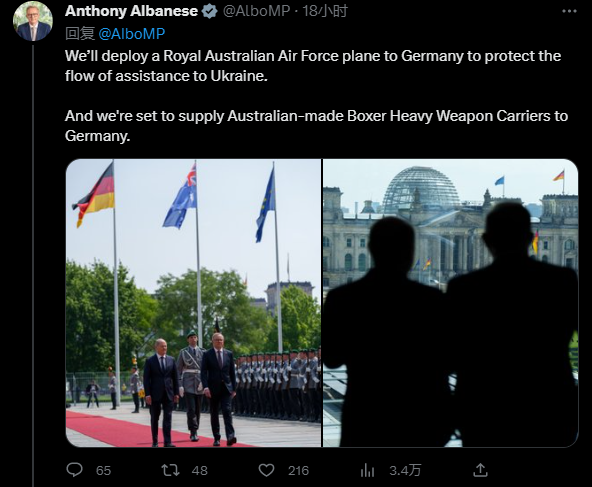 (观察者网讯)从弹药、防空系统到豹式坦克……俄乌冲突后,德国在援乌武器上可谓"尽心竭力",这也导致该国武器库存连连告急。当地时间7月10日,正在德国访问的澳大利亚总理阿尔巴尼斯宣布,将在德国部署一架空军侦察机,同时将向德军方交付100多辆澳制"拳击手"装甲车。