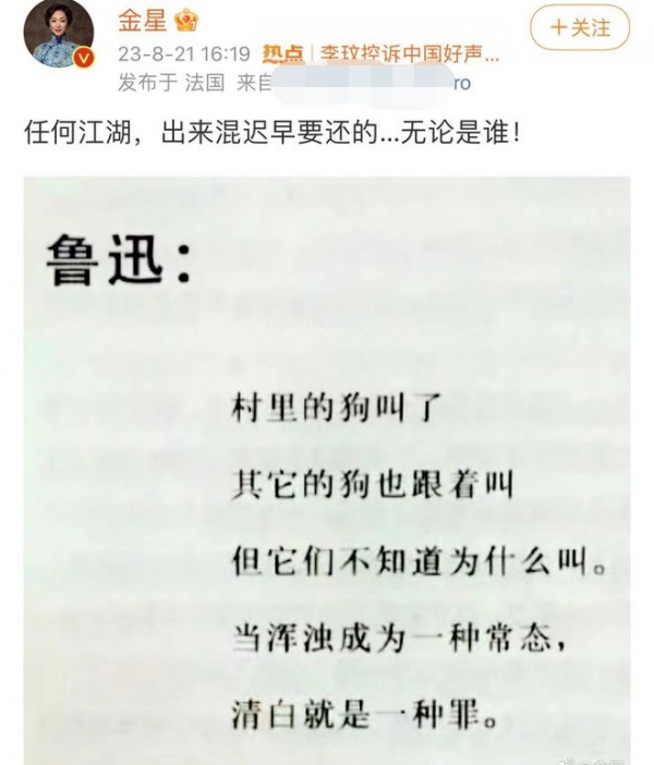 前不久,李玟和浙江台好声音节目的风波闹得沸沸扬扬,但娱乐圈鲜有人发声,金星却顶住压力接连发文声援李玟,并暗讽圈内的黑幕。她也因此受到了一些非议。