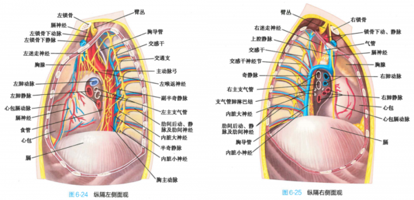 左图为纵膈的左侧面观,右图为纵膈右侧面观 图源:《系统解剖学 第 9 版》