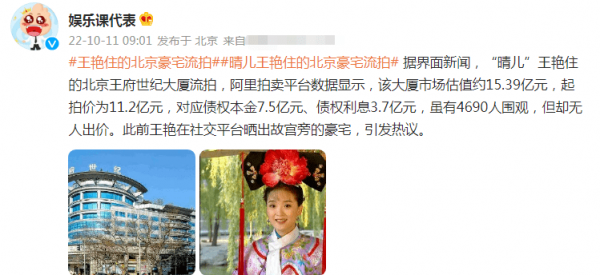以前都传王艳的老公有百亿身家,住的也是坐落于故宫旁的顶级豪宅王府世纪大厦,王艳有需要那么操心的事吗?不过就在去年,有媒体报道王艳所住的王府世纪大厦已出售拍卖,大厦市场估值15亿左右,但王艳不惜降到11.2亿的起拍价价格起拍,然而最终这套房产还是流拍。