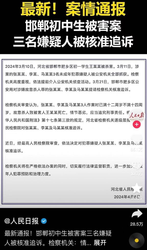 终于有后续了,备受关注的邯郸初中生杀人案今日有了最新进展,官方通报:最高检核准追诉3名未成年人刑事责任!