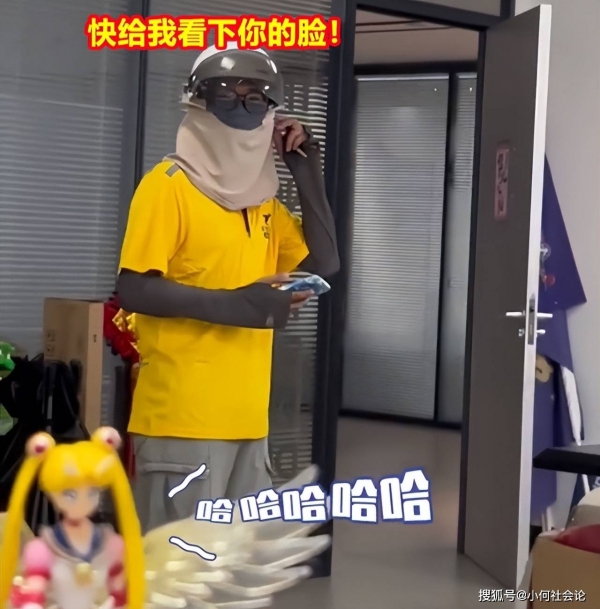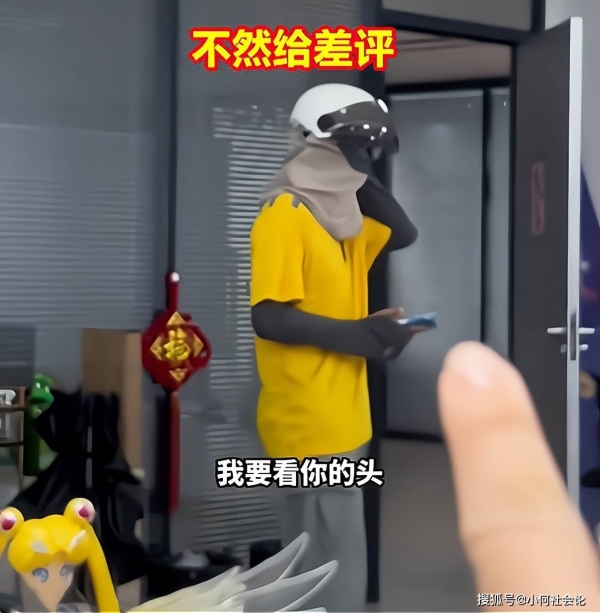 听到女子的话后外卖小哥停下脚步,不过他并没有打算脱下面罩,只是回头笑了笑就准备离开,可这时女子却大喊道:"我给你差评啊,你赶紧给我看看你的头!"