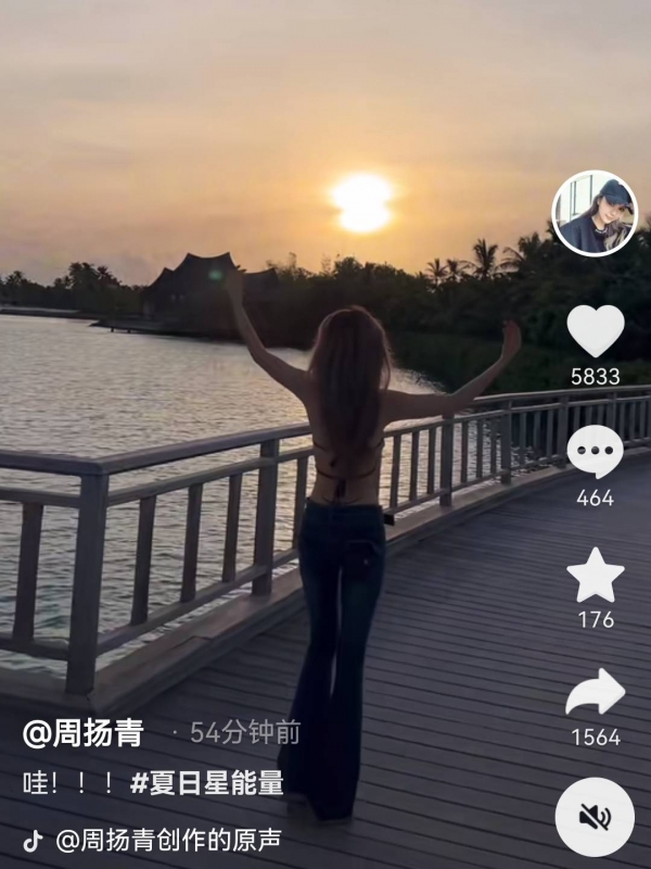周扬青还分享了一段视频,大概是因为向阳拍摄,所以画面显得特别暗沉,但是丝毫不影响大家对她的好身材的欣赏。