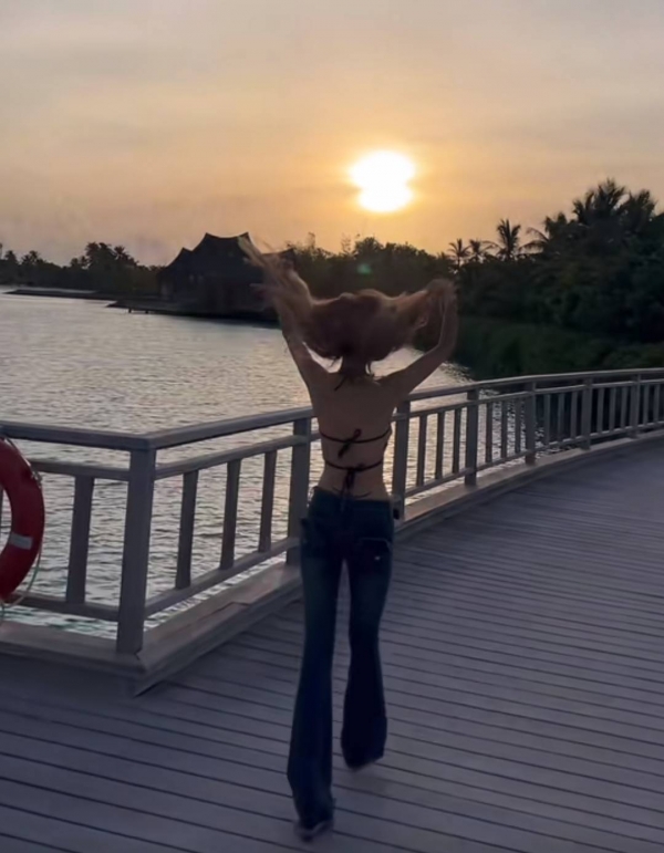 马尔代夫的水非常澄澈,但是景美人更美。周扬青扶着栏杆,歪着脑袋,长发飘逸,肩膀上的锁骨清晰可见,腰肢也十分纤细,大长腿相当吸睛。不得不说美的人穿什么都好看,凹什么造型都养眼,可能换作普通人做这些动作的话,就会显得很做作。