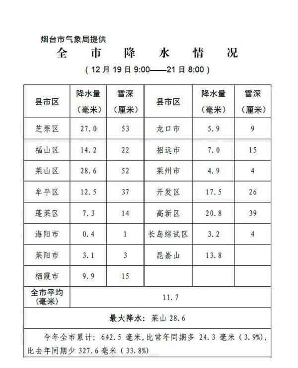 12月21日,记者从烟台市气象局得到最新消息,截至21日8时,位于烟台莱山区的山东烟台国家站积雪深度已达52厘米,大幅打破烟台历史最深积雪纪录。原纪录为39厘米,出现在2005年12月12日。截至8时,烟台最大积雪深度已达到53厘米,出现在芝罘区。