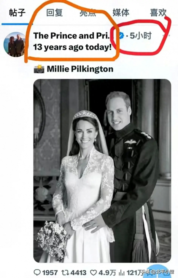 4月29日是威廉王子和凯特王妃结婚13周年纪念日,当天,威尔士夫妇的官方账号发布了一张令人匪夷所思的照片,这是一张旧照片不说,还是黑白的。