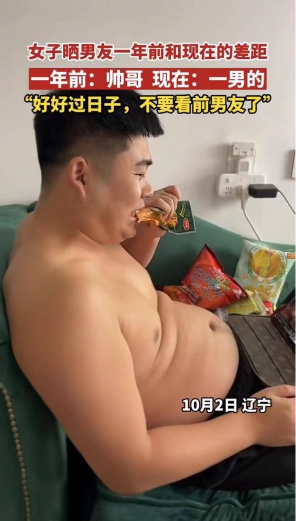 男子光着上半身坐在沙发上,满身肥嘟嘟的肌肉,腆着大肚子,面前摆着笔记本,手里拿着鸡爪用力地撕咬,吃得那叫一个惬意,当他看到女友偷偷拍摄自己的时候,顺手拿起一袋薯片,上前遮住了女友的手机镜头。