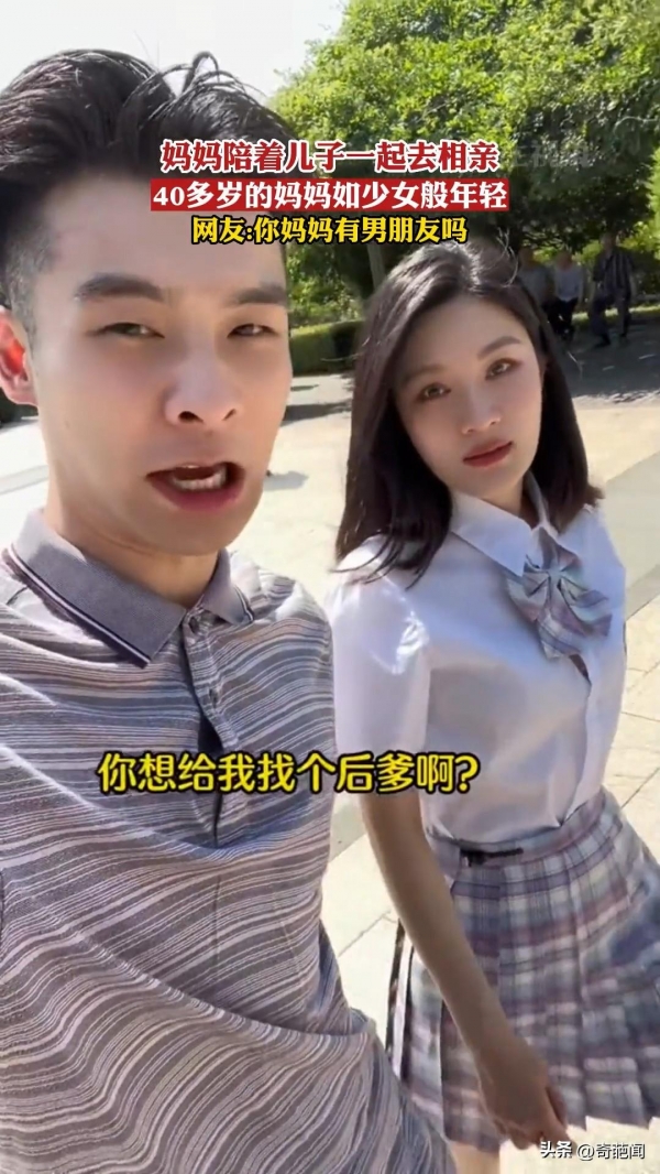 视频画面中这位妈妈打扮成学生的样子,如同少女般年轻,只见她上身穿着短袖校服搭配下身JK百褶裙,与一旁穿着朴素、扮成大叔模样的儿子形成鲜明对比,而当她们走到相亲角时,路人看到纷纷不淡定了。