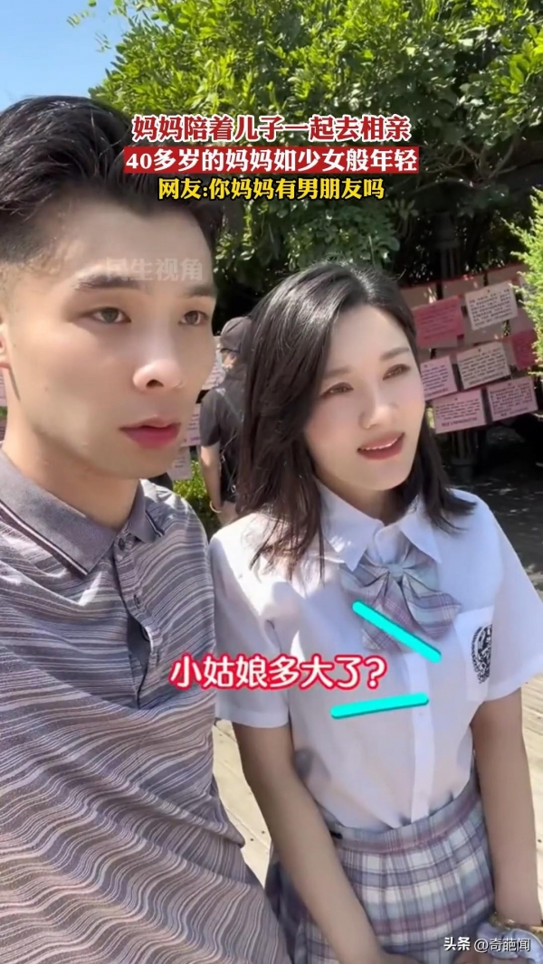 大家都以为这位妈妈是在带着情人去约会,于是引起了不小的轰动;事后这位妈妈解释说自己是带着儿子来相亲的,可能穿着打扮不够合适,导致路人产生了误会,自己也只想儿子能找到一个好归宿。