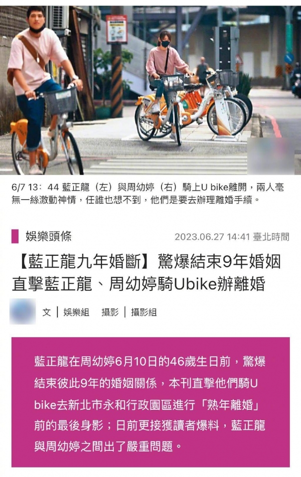 6月27日,据台媒消息,44岁男星蓝正龙与周幼婷离婚,结束9年婚姻。两人被拍到穿着情侣装,一起骑共享单车去办理离婚手续。