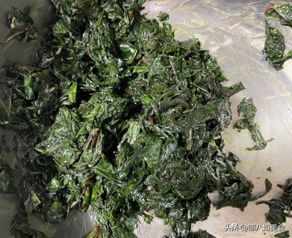 红薯叶清洗干净,控水后切碎,加少许盐抓揉,变得有点软之后分次加入面粉。