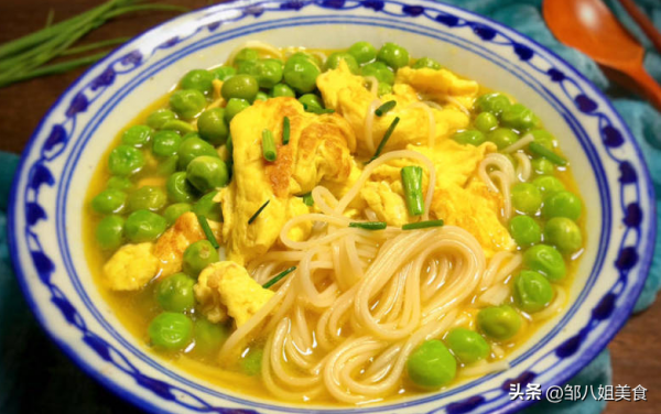豌豆熟透后再加适量水,再次煮开时放入面条,将面条煮熟。