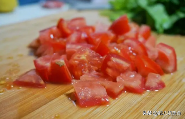 西红柿洗净,顶部划上十字刀,放进煮开的水中浸泡,变皱后去掉外皮,再切成小块待用。