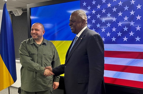 当地时间11月20日,乌克兰国防部长鲁斯特姆·乌梅罗夫(左)与美国国防部长劳埃德·奥斯汀在基辅会面