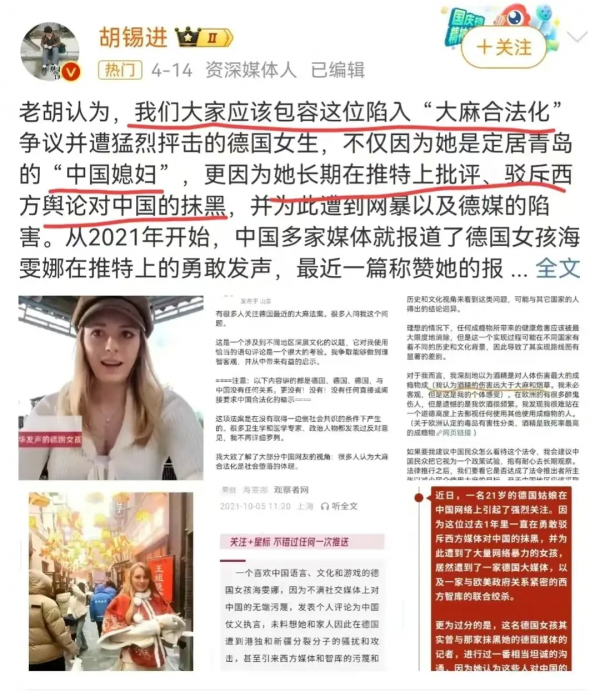 环球时报前主编胡锡进还跳出来,叫网友们不要对海雯娜指责太多,应该包容这位陷入"大麻合法化"的女孩!还打了感情牌,什么她是中国青岛的媳妇,帮过中国说话!
