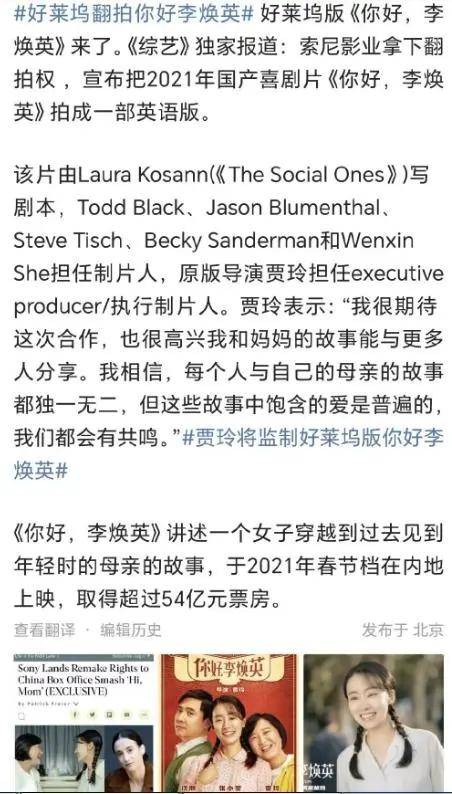 去年美国好莱坞索尼影业就宣布已经购得《你好,李焕英》翻拍版权,将会 把《你好,李焕英》拍成一部英文版。还邀请贾玲担任英文版的执行制片人。