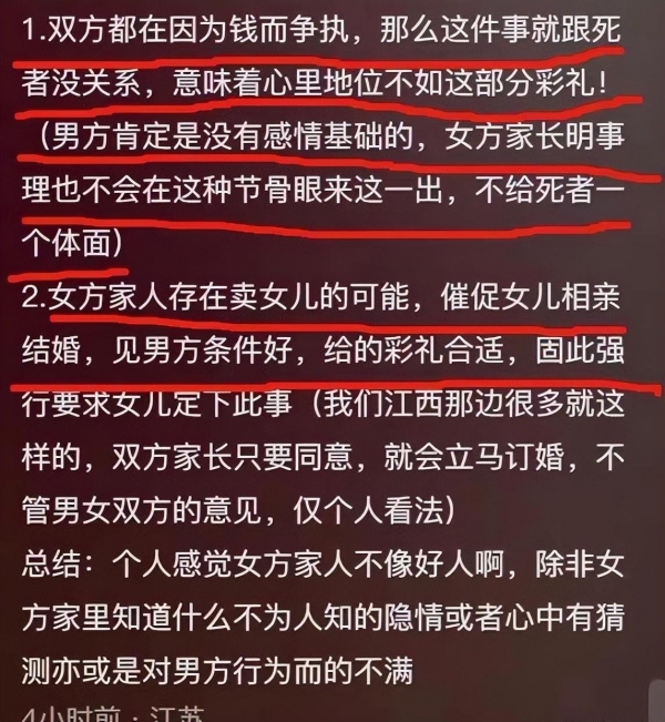 由于这件事太过炸裂,在网络上引发广泛讨论,有人说是骗彩礼,也有人应该关心新娘为何会死,她到底是经历了什么?
