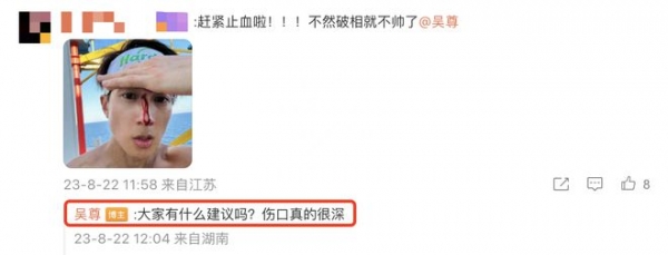 吴尊受伤引来了粉丝们的担心,网友喊话他赶紧止血,吴尊在线求助问:大家有什么建议吗?伤口真的很深。