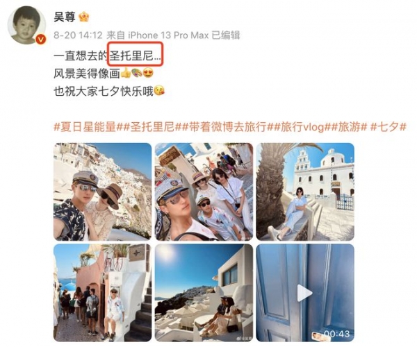 最近,吴尊就带着全家坐游轮出海旅行,先是来到了地中海,后来又去了圣托里尼,在世界各个地方留下脚印。