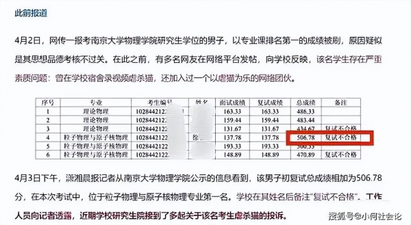 最近,东南大学一学生以"总成绩专业排名第一"的情况被南京大学给刷了下来,究其原因竟是学校查出涉事学生徐某某曾被举报虐猫。
