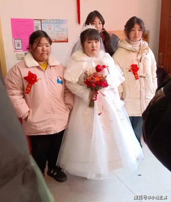 举行婚礼的时候,新郎的着装也显得很随意,西服都没有穿,就只是胸前戴了一朵喜庆的花,新娘倒是穿了一套美丽的婚纱。