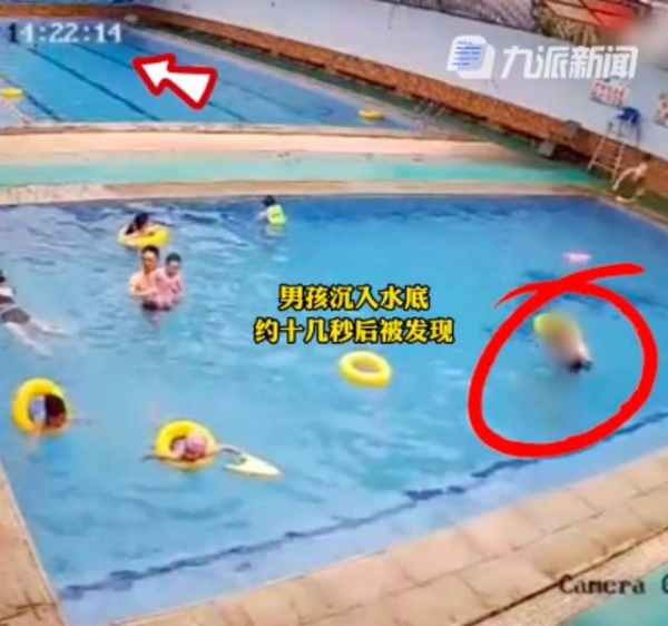1分多钟后,男孩沉入水底没有动静,周围有人围观,但无人发现异常。