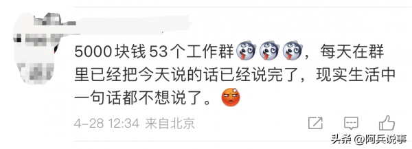 有网友表示,5000块钱53个工作群,群里面已经把今天说的话已经说完了,现实生活中一句话都不想说了。