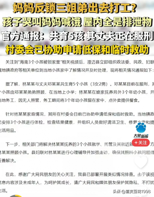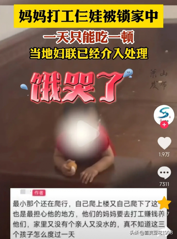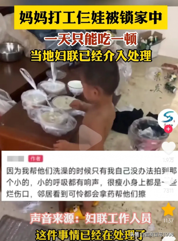近日海南一网友爆料称,一个妈妈外出打工将三个孩子锁在家中,一天只吃一顿饭。看着视频突然忍不住落泪,自己也是孩子的母亲,忍受不了孩子受委屈没饭吃。
