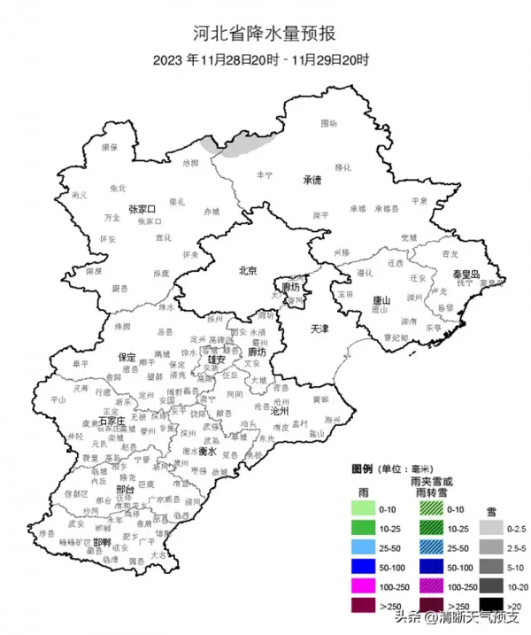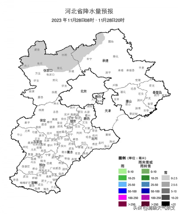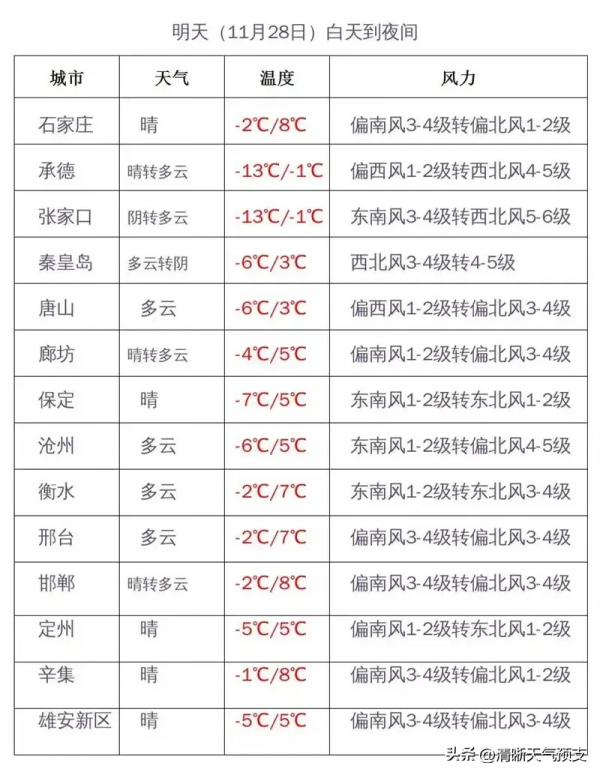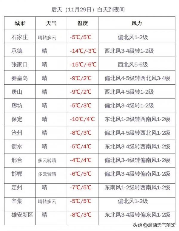 此外,气温也将下降。明天早晨,张家口、承德北部的最低气温将下降6到8℃,而承德南部、秦皇岛、唐山、保定、石家庄、邢台和邯郸四个地区的西部将下降3到5℃。整个省份的最高气温也会明显下降,大部分地区的最高气温将回到个位数。例如,邯郸今天最高气温为16℃,但后天将降至5℃,加上大风的影响,会明显感觉到风寒效应,请大家注意防风保暖。