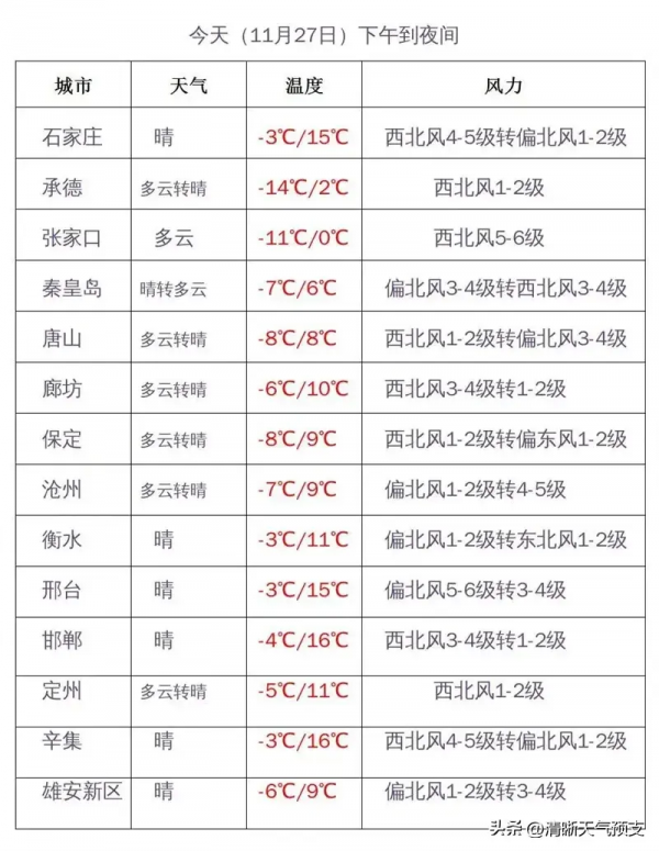 预计今天下午到夜间,张家口、承德、保定、石家庄、邢台和邯郸四个地区的西部将出现西北风4到6级,阵风7到8级;沿岸海域和沿海地区也将出现西北风5到6级,阵风7到8级。明天夜间到29日,全省大部分地区仍将有西北风4到6级,阵风7到8级;沿岸海域和沿海地区的风力也将保持在5到6级,阵风7到8级。