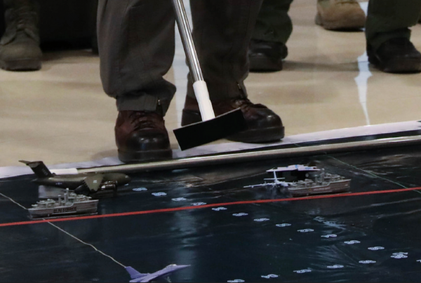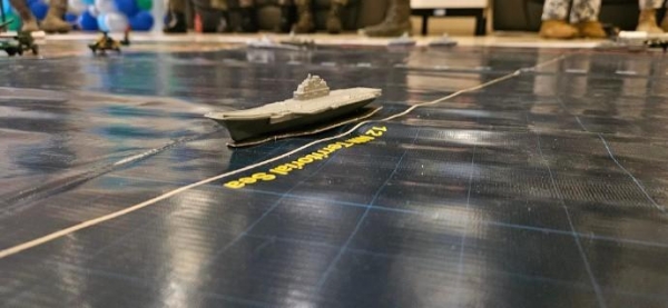 虽然美国和菲律宾方面都宣称演习并不针对中国,但在5月4日,菲军官拍摄的兵棋推演沙盘上,赫然出现了一艘外形酷似中国海军辽宁舰或山东舰的滑跃甲板航母模型,还被放置在标有"12海里领海"的黄线旁。考虑到本次演练是针对"反登陆和海上打击"的,很显然美菲正在模拟击沉中国航母的实战科目。