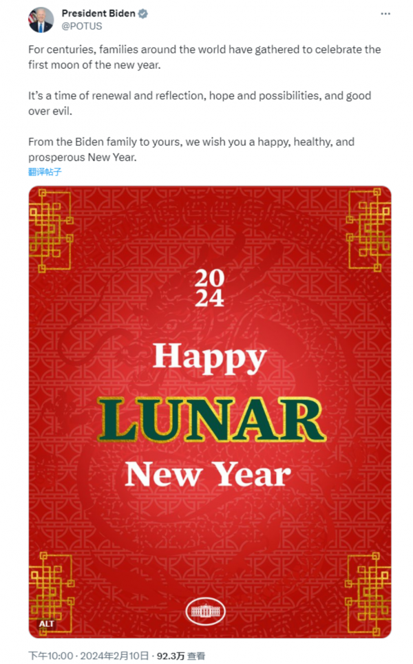 拜登在社交媒体上的拜年言辞充满了深意,他提到了家庭的团聚、新年的希望与可能性,以及正义战胜邪恶的时刻,显示出他对春节文化的理解和尊重。