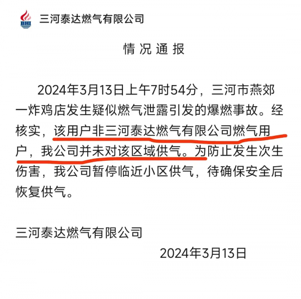 正当全国网友把注意力集中到这的时候,三河燕郊的泰达燃气公司发布了通告,表示没有在此区域供气,随后另一家百川燃气也表示此区域没通气。