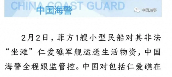 中国海警昨天发布声明,确认在2月2日,菲律宾出动了一艘小型民船对其非法"坐滩"仁爱礁的军舰运送生活物资,中国海警全程跟监警戒!在声明的最后,照例强调了中国对仁爱礁及其附近海域的主权,以及中国海警在该海域拥有执法权。
