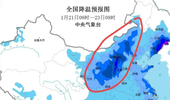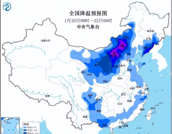 预计,1月21日08时至1月23日08时,内蒙古西部、东北地区中东部、西北地区东部、华北大部、黄淮东部、江淮大部、江南中东部和南部、西南地区南部、华南大部等地将先后降温6~8℃。