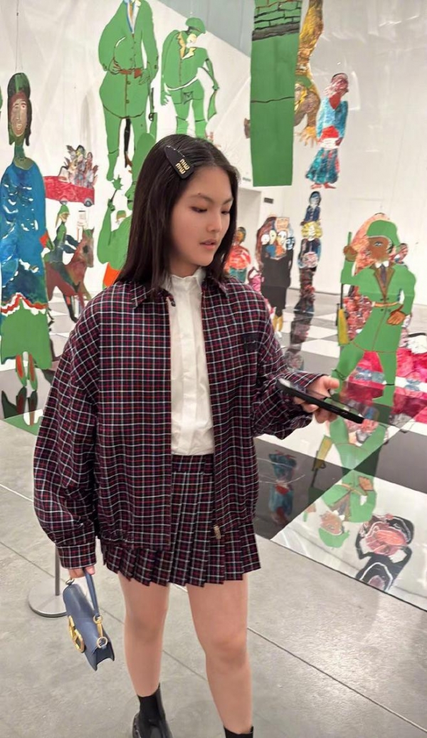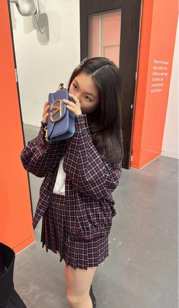 王诗龄的第一套选择了格纹元素,夹克+百褶裙都点缀着格纹,复古的气息顿显,也有点英国的感觉,像极了英式校服。