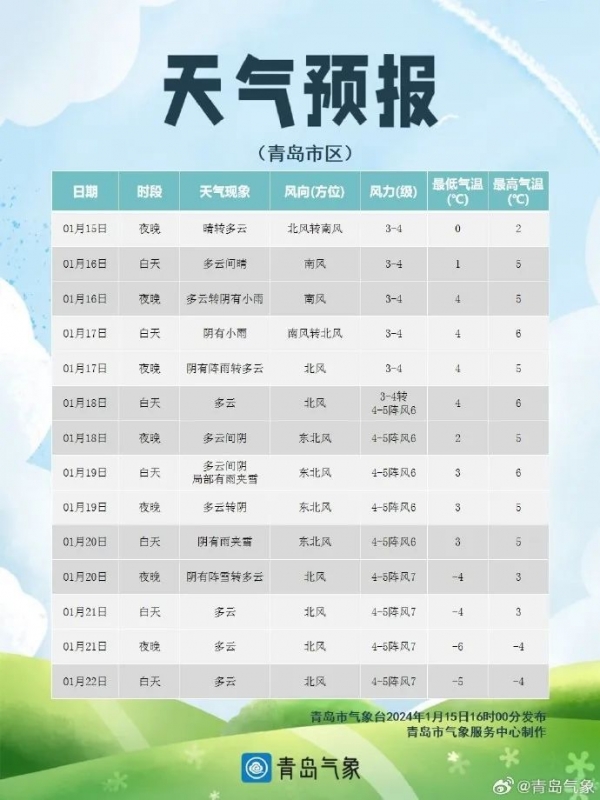 对于青岛的朋友,今天夜间开始,最低气温开始回升。明天白天转多云,最高气温小幅上升。后天凌晨到上半夜,青岛将会迎来小雨,出行请携带雨具。请留意阴雨的湿冷感觉,确保保暖。