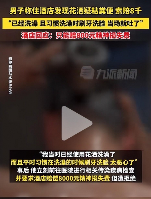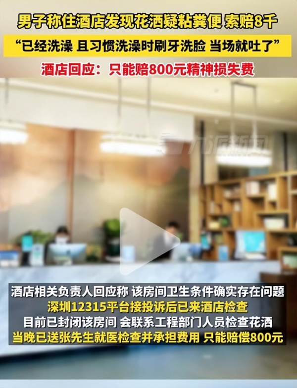近日,一起发生在深圳的酒店卫生事件引发了广泛关注。张先生出差时入住某酒店,却意外发现花洒上疑似粘有粪便,这一令人作呕的发现不仅让张先生当场呕吐,还让他对酒店的卫生状况产生了严重质疑。面对顾客提出的8000元精神损失费索赔,酒店方面仅表示愿意赔偿800元,这一回应更是激化了双方的矛盾。