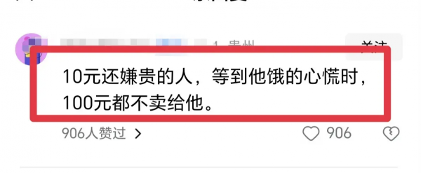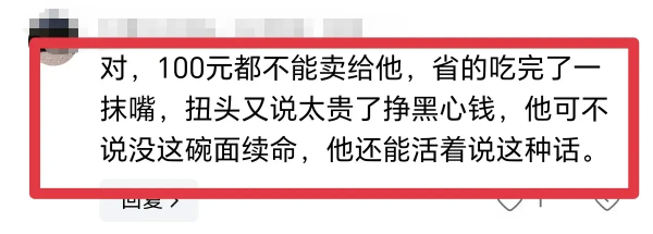 有人说对,100元都不能卖给他,省的吃完了一抹嘴,扭头又说太贵了挣黑心钱,他可不说这碗面能续命,他还能活着说这种话,嫌贵的不卖给他,贵贱不卖。