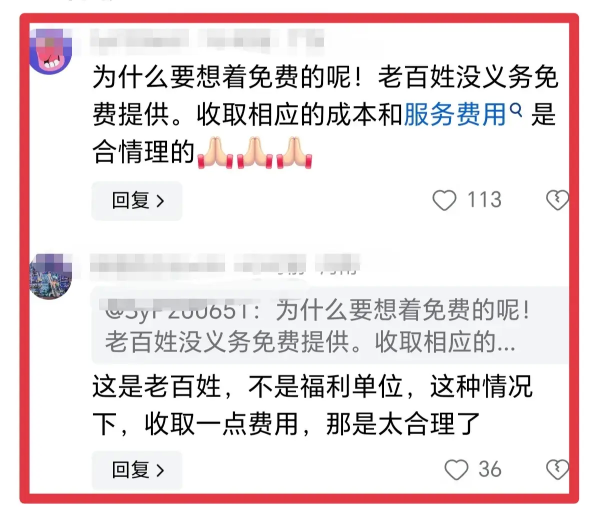 可是正如这些网友所说,为什么要想着免费的呢?百姓没有义务免费提供收取相应的成本和服务费是合情合理的。