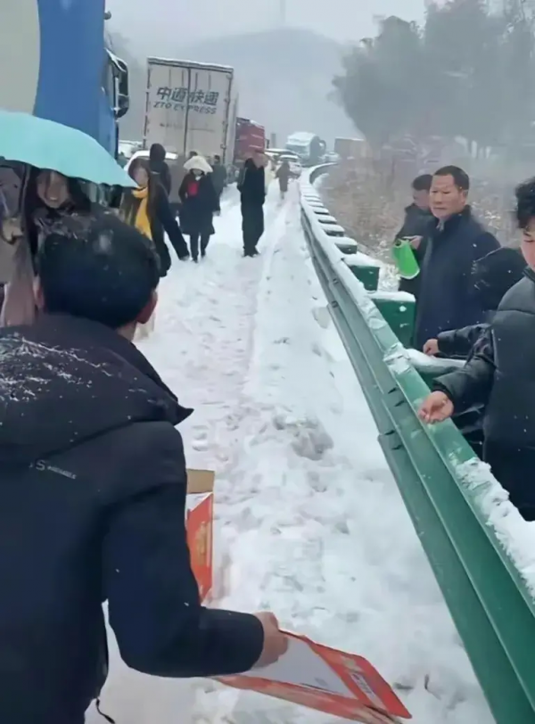 恐怕,此时对大家来说最渴望的就是能吃到一口热乎的东西了。在堵车路段附近的一些村民冒着大雪,背着泡面,提着开水,跨越高速公路跨栏,在过往的司机朋友之间,售卖泡面。