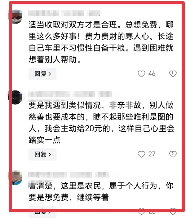 都是老百姓,不是福利单位,这种情况下收取一点费用,那是太合理了。适当收取对双方才是合理。总想免费哪里这么多好事?费力费财的寒人心,长途自己车里不习惯性自备干粮,遇到困难就想着别人帮助。