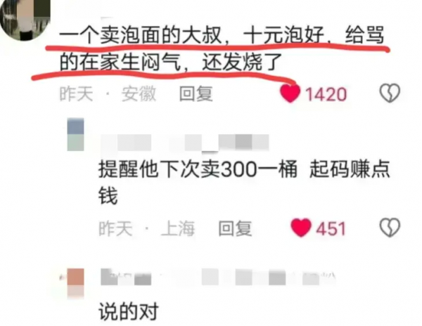 有位网友反应,一位卖泡面的大叔,十元泡好给骂的在家生闷气,还发烧了。其他网友纷纷为他打抱不平,说下次让他卖300一桶,起码赚点钱