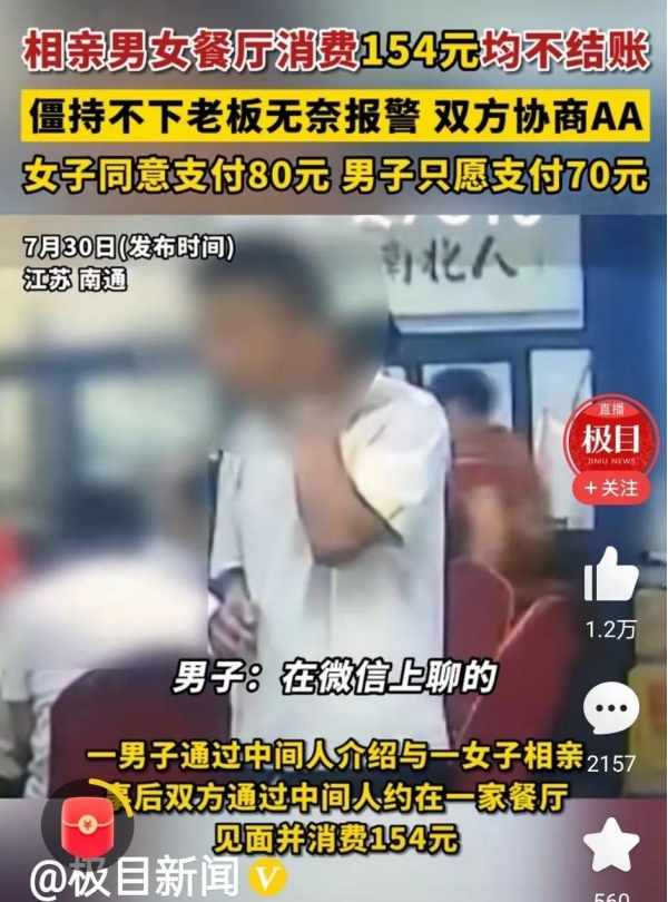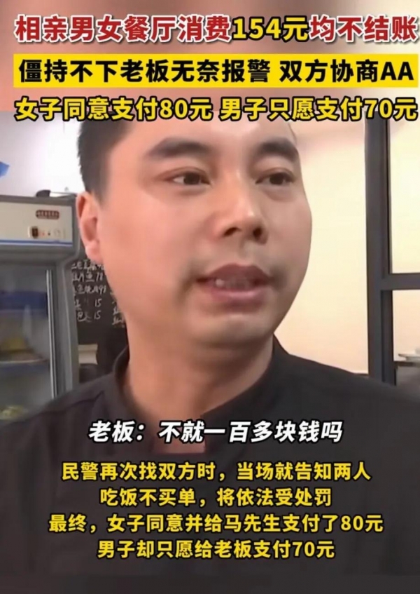 最近,江苏南通一男一女在餐厅相亲后,对于154元饭钱,两个人没有一人愿意买单,最后老板无奈选择报警,两人经过协商选择AA制付账,但是两人还是很长时间不付账,老板无奈气愤的又选择报警,最后在警察警告后,两人将账单结清。