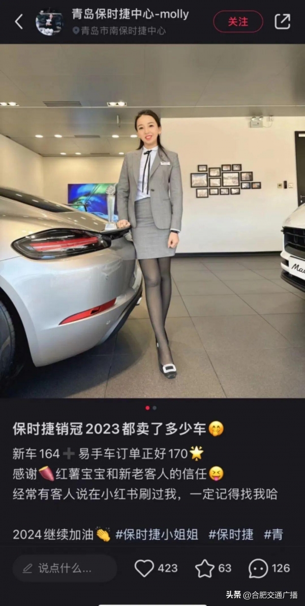 据品牌相关负责人介绍,2023年青岛保时捷总销售量约在1000台,Molly一人成交的170台在全年总销售额中约占比17%。