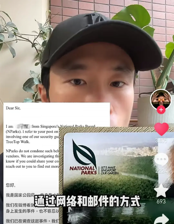 根据旅游博主童话讲述,新加坡国家公园局通过网络和邮件的方式通知他,那名做出羞辱性手势的工作人员已经被找到,是该保护区的一名安保人员,新加坡国家公园局表示,当地保护区已经在调查此事。