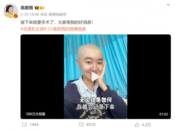 3月1日,高君雨的家人发文称,"小雨已经进手术室了,希望一切顺利。"3月2日,其社交账号再次更新:"手术进行了12个小时,好在手术很成功,大家不用担心。"
